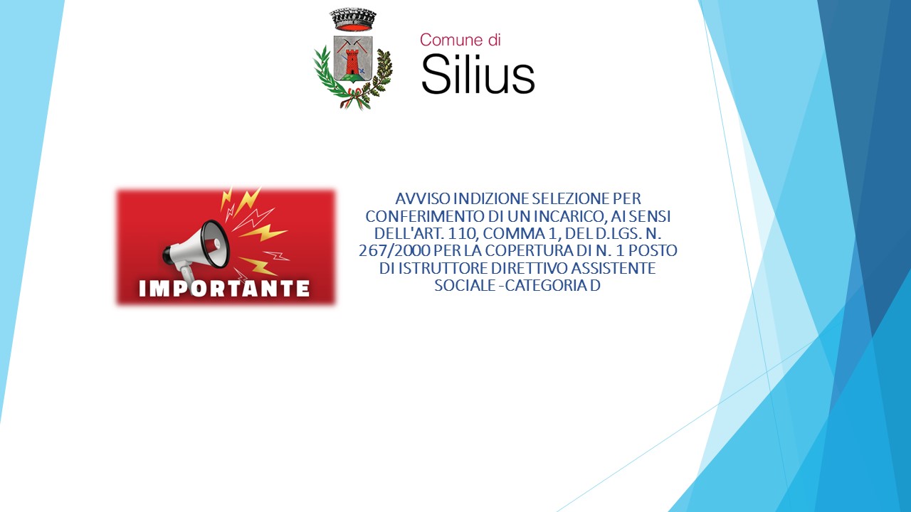 SI RENDE NOTO CHE E' INDETTA UNA SELEZIONE PER IL CONFERIMENTO DI UN INCARICO, AI SENSI DELL’ART. 110, COMMA 1, DEL D.LGS. N. 267/2000 A TEMPO PIENO E DETERMINATO (PER N. 36 ORE SETTIMANALI), PER UN PROFILO DI “ISTRUTTORE DIRETTIVO ASSISTENTE SOCIALE”, CATEGORIA GIURIDICA D, POSIZIONE ECONOMICA D1, PRESSO L’AREA SOCIALE LA DOMANDA DI PARTECIPAZIONE ALLA SELEZIONE DEVE ESSERE REDATTA IN CARTA LIBERA SECONDO LO SCHEMA ALLEGATO AL PRESENTE AVVISO E PERVENUTA AL COMUNE DI SILIUS, VIA ALDO MORO N. 14, SILIUS (SU), A PARTIRE DAL 10.07.2023 - ENTRO E NON OLTRE LE ORE 23:59 DEL GIORNO 26.07.2023. LA DOMANDA POTRÀ ESSERE PRESENTATA MEDIANTE: a. RACCOMANDATA A/R. SI PRECISA CHE NELLA BUSTA CONTENENTE LA DOMANDA IL CANDIDATO DOVRÀ APPORRE LA SEGUENTE DICITURA: “MANIFESTAZIONE DI INTERESSE SELEZIONE PER IL CONFERIMENTO DI UN INCARICO DI “ISTRUTTORE DIRETTIVO ASSISTENTE SOCIALE”, AI SENSI DELL’ART. 110, COMMA 1, DEL D.LGS. N. 267/2000 A TEMPO PIENO (36 ORE) E DETERMINATO”; b. PRESENTAZIONE DIRETTA ALL’UFFICIO PROTOCOLLO DEL COMUNE, DURANTE GLI ORARI DI APERTURA AL PUBBLICO. L’UFFICIO PROTOCOLLO RILASCERÀ APPOSITA RICEVUTA ATTESTANTE LA DATA E L’ORA DI PRESENTAZIONE; c. PEC(POSTA ELETTRONICA CERTIFICATA) AL SEGUENTE INDIRIZZO: PROTOCOLLO@PEC.COMUNE.SILIUS.CA.IT ESCLUSIVAMENTE TRAMITE CASELLA DI POSTA ELETTRONICA CERTIFICATA (PEC) INTESTATA AL CANDIDATO. LA DOMANDA E GLI ALLEGATI DOVRANNO ESSERE FIRMATI DIGITALMENTE DAL CANDIDATO OPPURE STAMPATI, SOTTOSCRITTI, SCANSIONATI E SUCCESSIVAMENTE TRASMESSI SOTTO FORMA DI ALLEGATO IN FORMATO PDF. NELL’OGGETTO DELLA PEC IL CANDIDATO DEVE APPORRE LA SEGUENTE DICITURA: “MANIFESTAZIONE DI INTERESSE SELEZIONE PER IL CONFERIMENTO DI UN INCARICO DI “ISTRUTTORE DIRETTIVO ASSISTENTE SOCIALE”, AI SENSI DELL’ART. 110, COMMA 1, DEL D.LGS. N. 267/2000 A TEMPO PIENO (36 ORE) E DETERMINATO”. IN TAL CASO LA VALIDITÀ DELLA TRASMISSIONE E RICEZIONE DEL MESSAGGIO È ATTESTATA RISPETTIVAMENTE DALLA RICEVUTA DI ACCETTAZIONE E DALLA RICEVUTA DI AVVENUTA CONSEGNA RILASCIATA DAL SISTEMA. LA MODULISTICA E L'AVVISO DI SELEZIONE SOON REPERIBILI SUL SITO WEB DEL COMUNE DI SILIUS HTTPS://www.comune.silius.ca.it - SEZIONE ALBO PRETORIO ON LINE ED IN AMMINISTRAZIONE TRASPARENTE SOTTO SEZIONE BANDI DI CONCORSO AL LINK https://albo.comune.it/Silius/AmministrazioneTrasparente/BandiConcorso?dettaglio=184