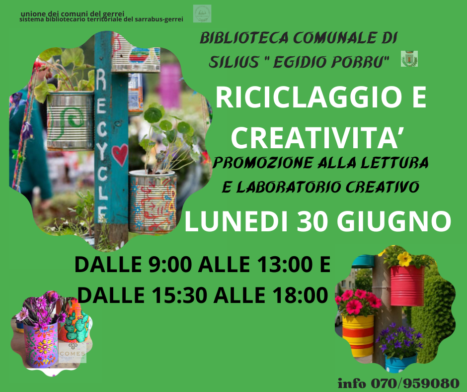 IL COMUNE DI SILIUS VI INVITA A PARTECIPARE ALLA GIORNATA DI LETTURA DAL TITOLO "RICICLAGGIO E CREATIVITA'". VI ASPETTIAMO LUNEDI' 30 GIUGNO 2025 DALLE 9:00 ALLE 13:00 E DALLE 15:30 ALLE 18:00, PRESSO LA BIBLIOTECA COMUNALE "EGIDIO PORRU" .