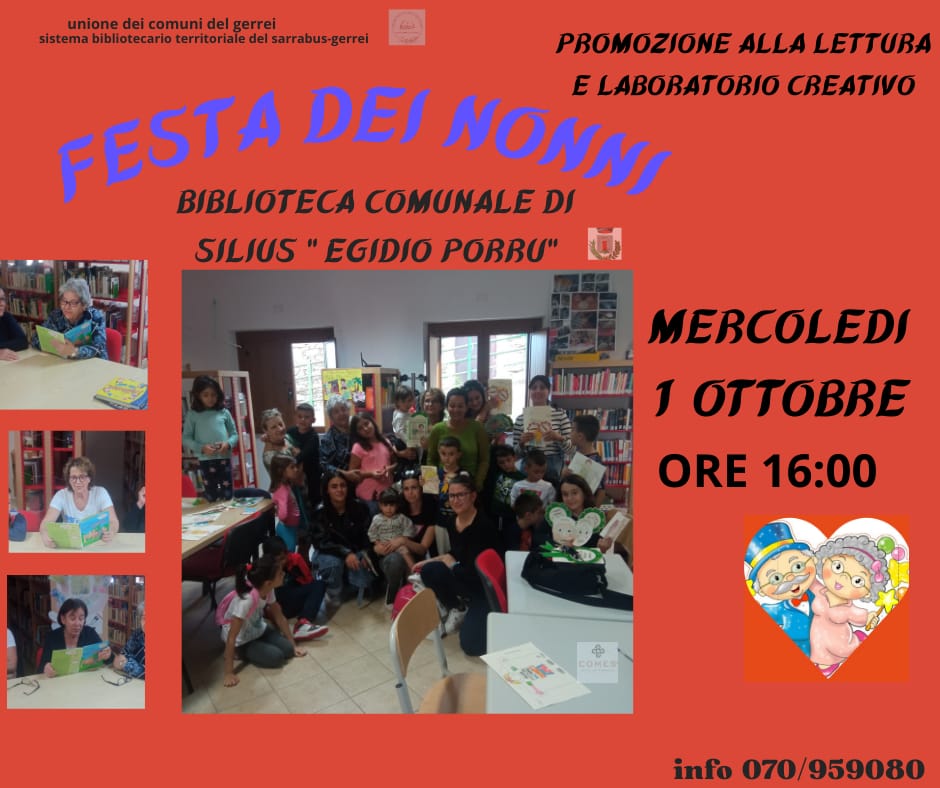 IL COMUNE DI SILIUS VI INVITA A PARTECIPARE AD UNA SERATA DI PROMOZIONE ALLA LETTURA E LABORATORIO CREATIVO DAL TITOLO: "FESTA DEI NONNI" CHE SI TERRA' MERCOLEDI' 1 OTTOBRE 2025 ALLE ORE 16:00, PRESSO LA BIBLIOTECA COMUNALE "EGIDIO PORRU" .