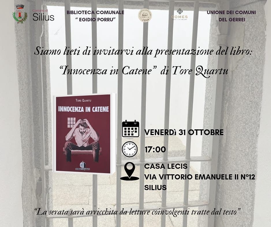 Venerdì 31 Ottobre alle ore 17:00, presso Casa Lecis, si terrà la presentazione del libro "Innocenza in catene" di Tore Quartu.