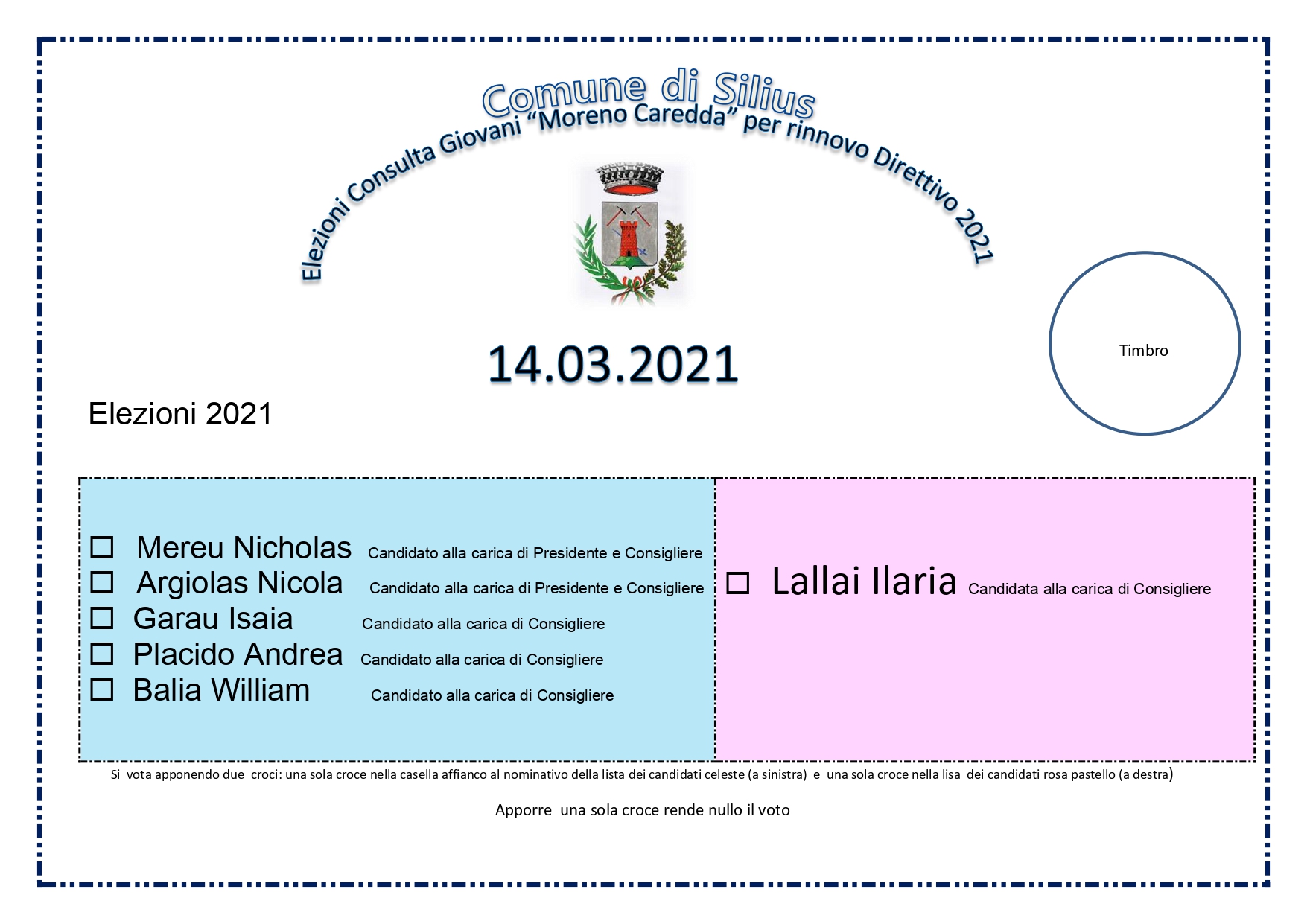 CON DECRETO N. 1 DEL 12 FEBBRAIO 2021, SONO STATE INDETTE LE ELEZIONI PER IL RINNOVO DEL CONSIGLIO DIRETTIVO DELLA CONSULTA GIOVANI "MORENO CAREDDA" SILIUS. LE ELEZIONI SONO FISSATE PER IL GIORNO 14 MARZO 2021, DALLE ORE 17.00 ALLE ORE 21.00 PRESSO LA SALA CONSILIARE DEL COMUNE DI SILIUS.